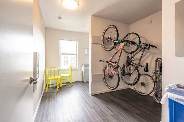 Every studio is designed for functionality: dedicated bed space, closet storage, a private bathroom, two shared kitchens per floor, on-site laundry, and secure bike storage for active Portland living.