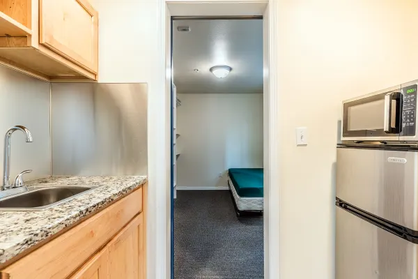 Thoughtful micro-apartment layouts maximize function — private bathrooms, kitchenettes with fridge and microwave, and select lofted units that expand usable space.