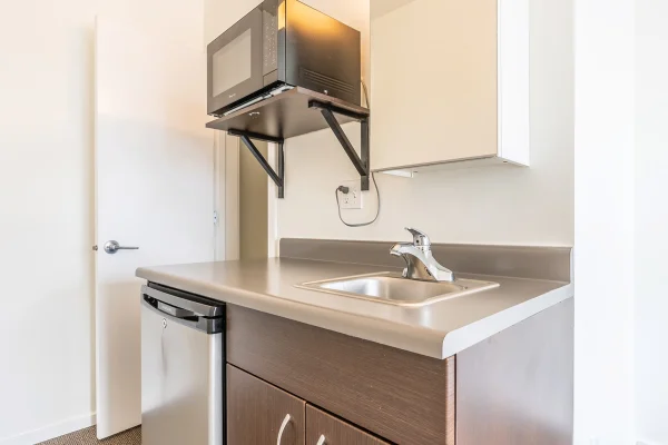 Units include compact kitchen sinks, a microwave, and a mini fridge—everything you need for daily meals without wasted space. Shared full kitchens are available for larger meal prep.