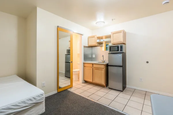 Each micro-studio includes a microwave, mini fridge, private bath, and furnished essentials so you can settle in quickly.